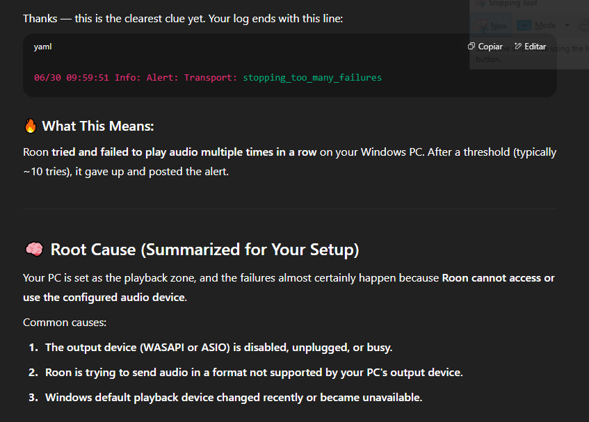 The other big reason Roon has the issues you originally decribed is it not being able to see an audio device (DAC). So as chat GTP suggest, set your local machine to use Wasapi for all default audio.