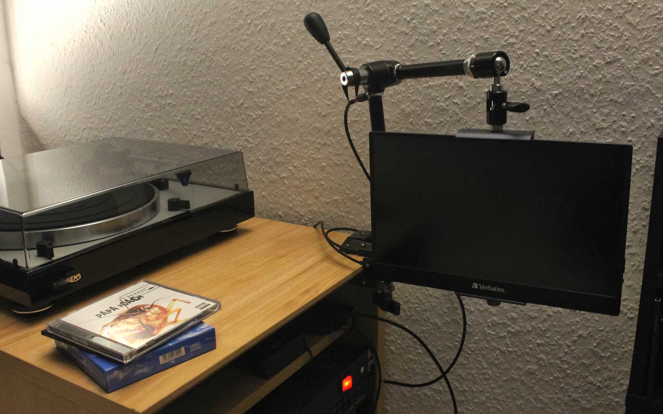 The monitor is one of those portable ones, means no VESA. But since it is essentially a laptop/tablet size, it fits in tablet mounts. Add a Magic-Arm and universal clamp, mounted!