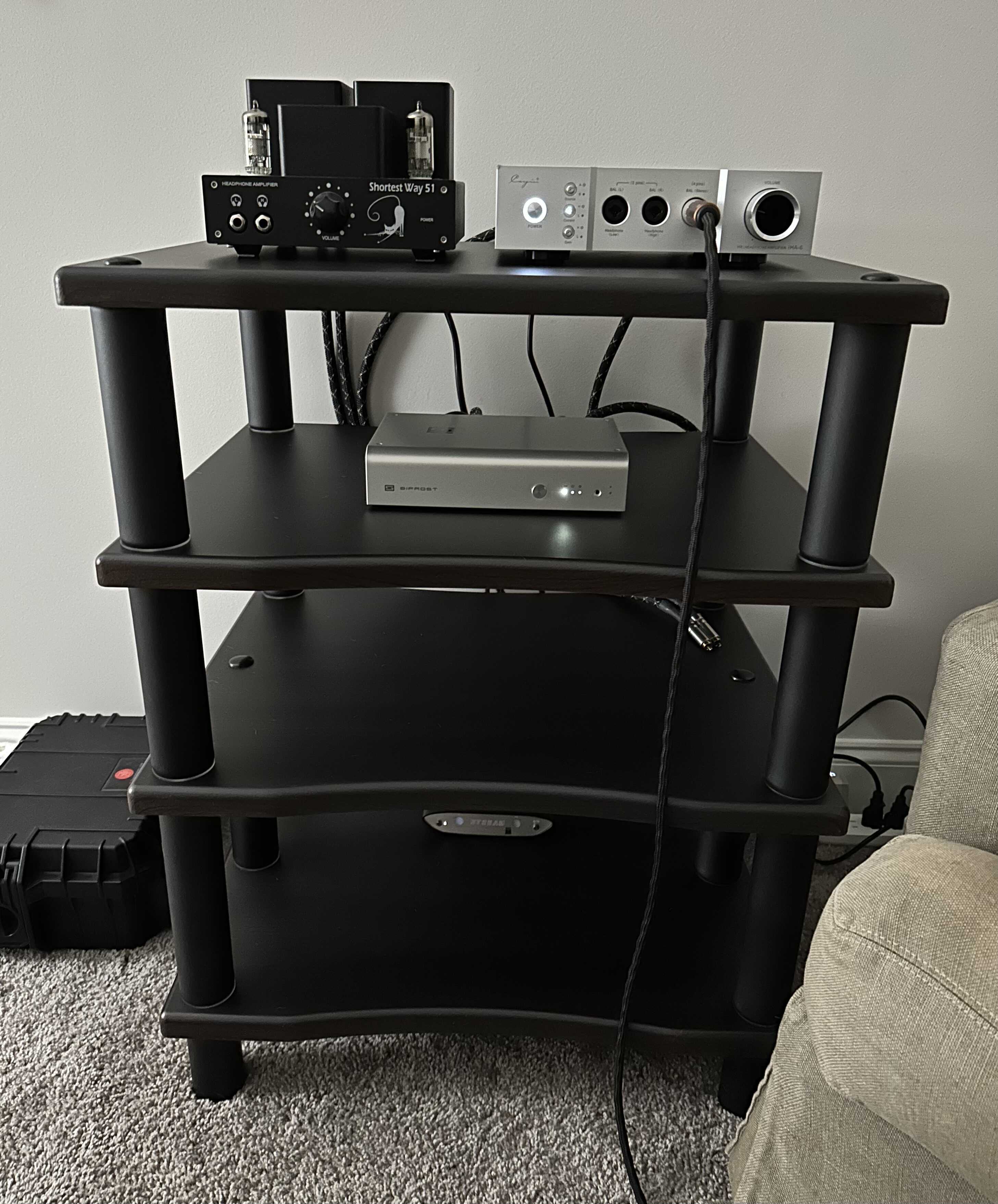 I finally invested in a nice basic audio rack. I got the Monoprice “Espresso” one because it was on sale. It was relatively easy to assemble and seems very sturdy. It’s quite a bit heavier than I expected. Luckily for me it arrived before the Yggy. I wasn’t sure where I was going to put that monstrosity before ordering this rack.