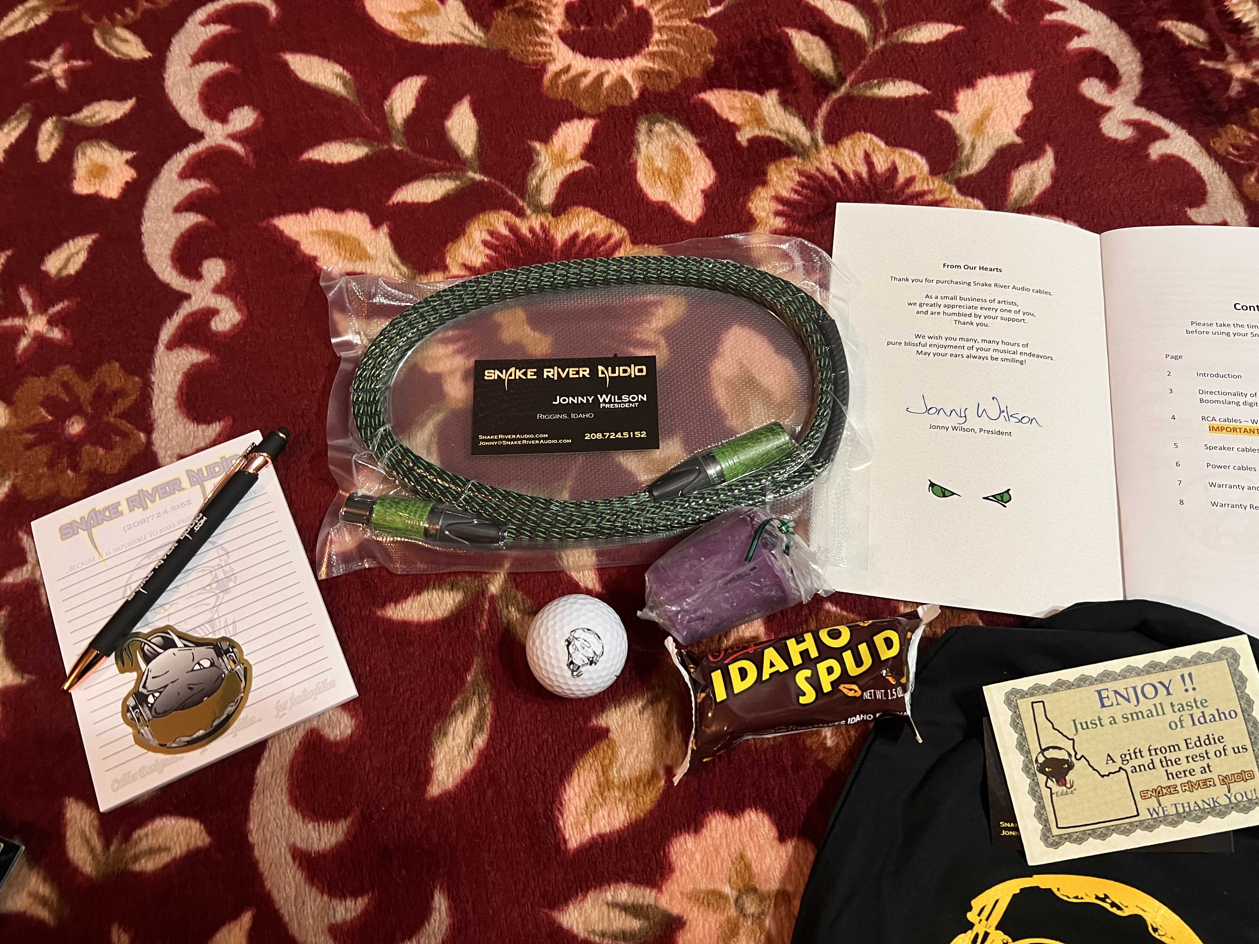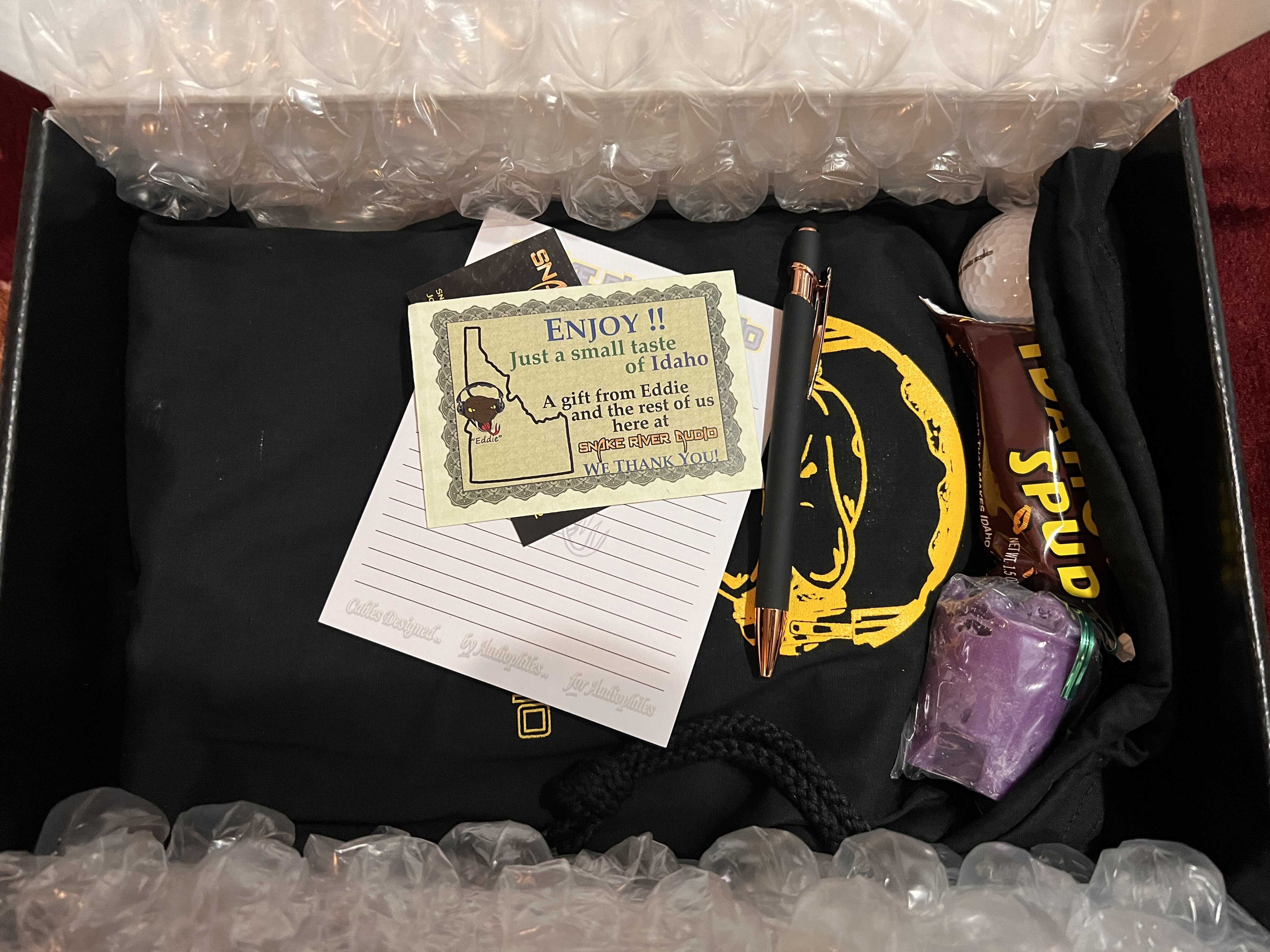 . I am ex sneaker head and one of my favorite aspect is unboxing limited edition boxes. Man, does Snake River Audio know how to pack a package! I know everyone posted their unboxing so I know what’s coming, but seeing this in person makes me feel like a kid on Christmas Day! The box itself with the snake stickers are pretty cool. Unboxing it, I get a whiff of fresh scented candle. And of course, how can I forget about everyone favorite Idaho Spud!