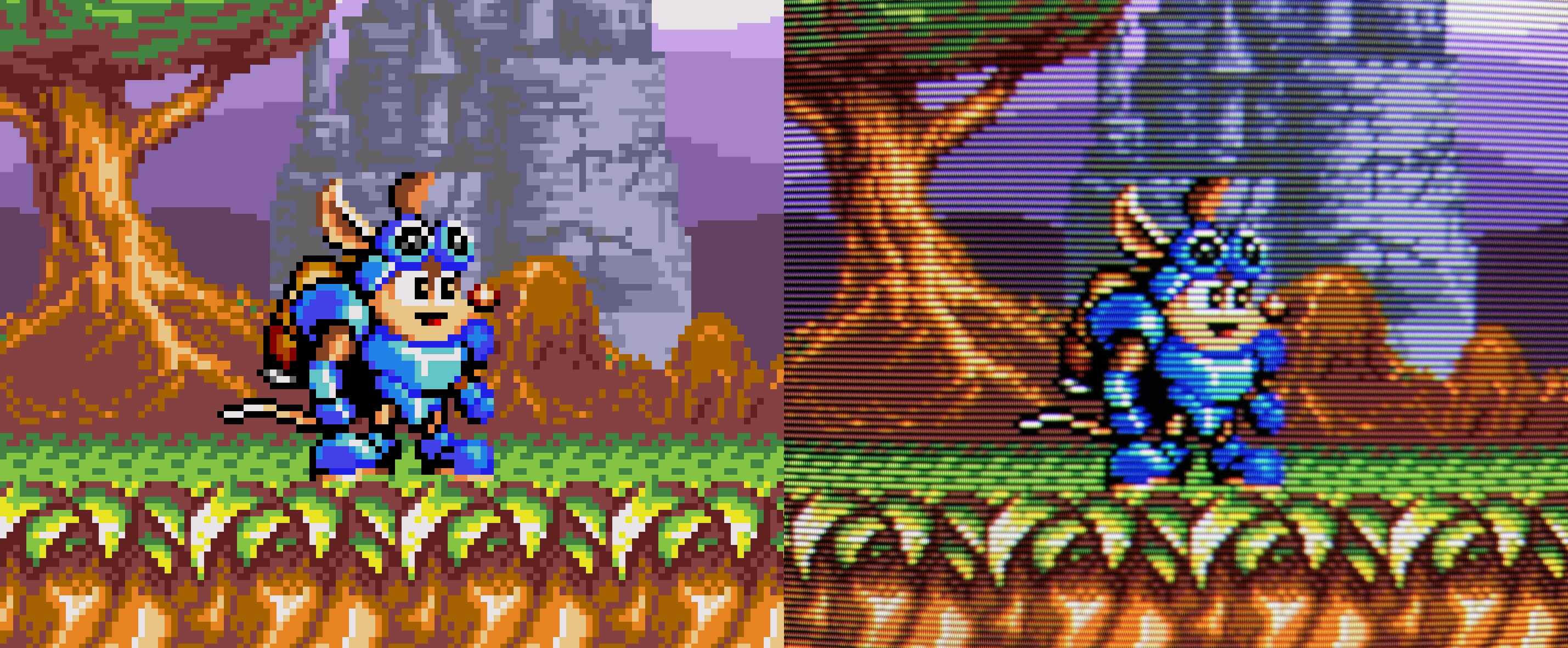 It’s maybe obvious that I wouldn’t want to watch an HDR movie on the CRTs in my office (even on a quite high-end CRT), but for the other way around, here’s an example image of what a retro game might look like on each of the two systems (courtesy of the CRT Pixels Twitter account):